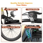 7-speed precise gear shifting + 400W silent motor, 23-mile pure electric range, pedal assist up to 40 miles, effortless commuting even on hills.