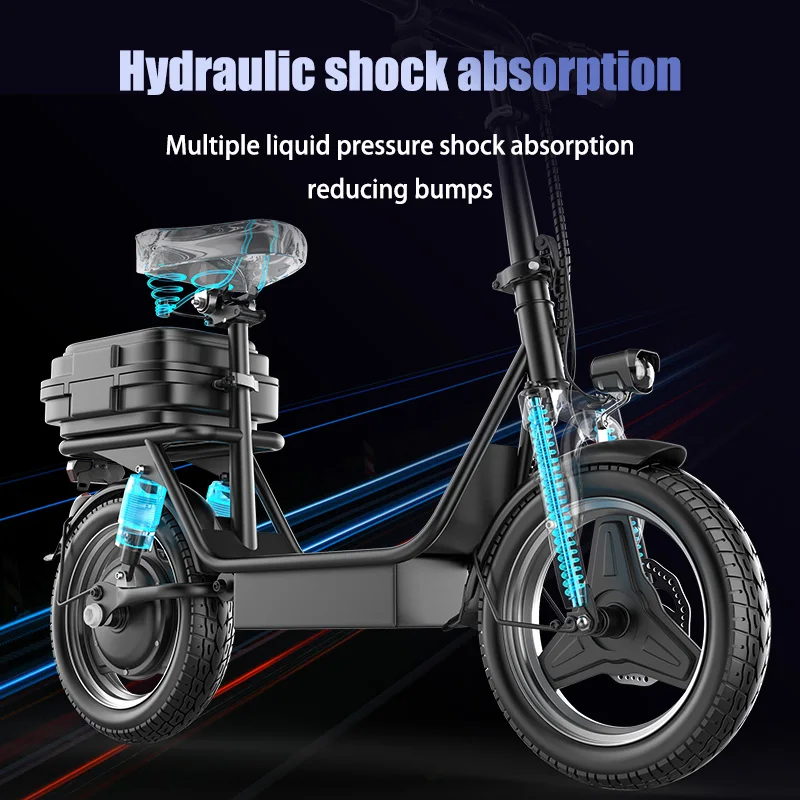 [Full Suspension and 14" Fat Tires] The e scooter comes with full shock absorptions (front, rear suspension, and seat shock) that significantly reduce shock, making your ride more comfortable and stable. The 14" large pneumatic tires have excellent grip, high elasticity, and wear resistance,suitable for multiple road conditions